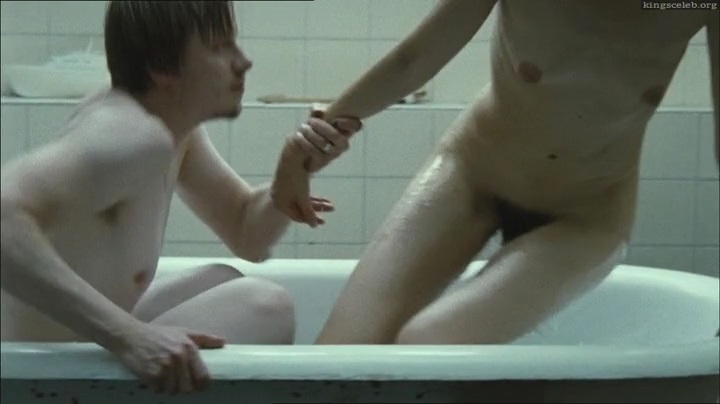A naked Jeanne Balibar tries to get out of the bathtub, but her boyfriend won't let her.