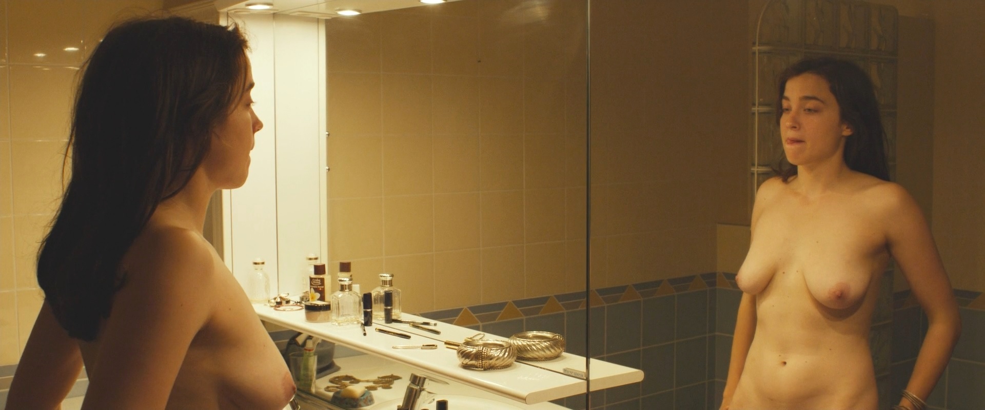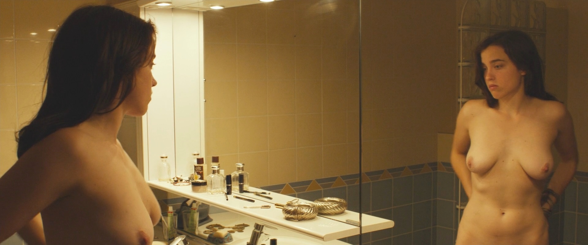 Adele Haenel stands in front of the mirror and touches her bare breasts.