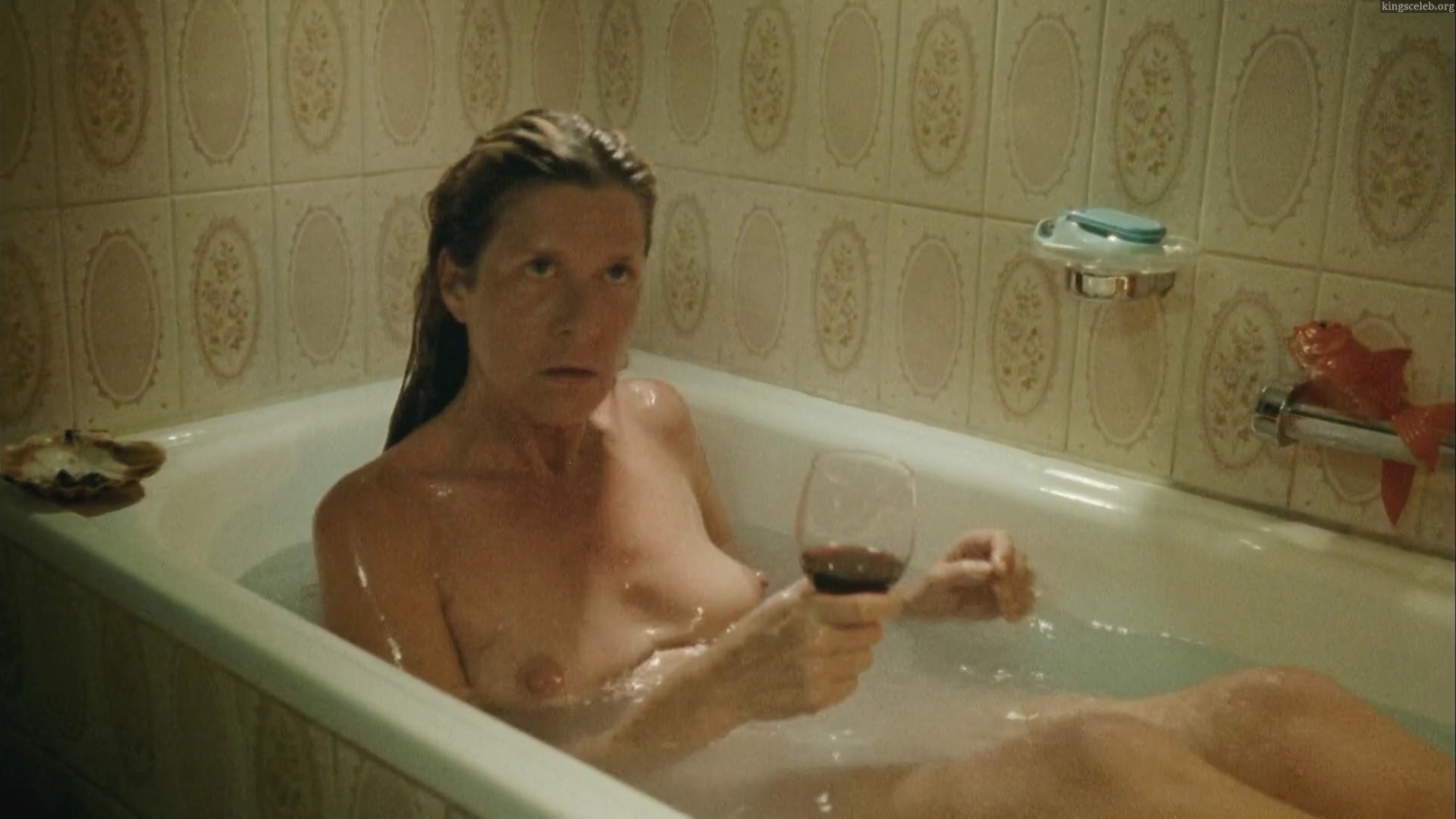 Barbara Sarafian Lying naked in the bath, drinking wine, smoking and talking on the phone.