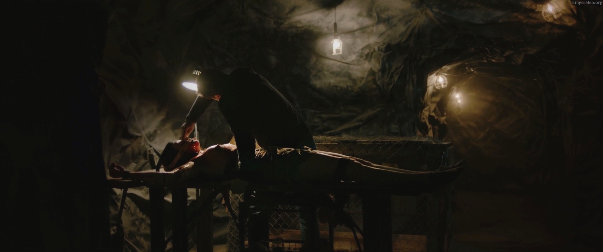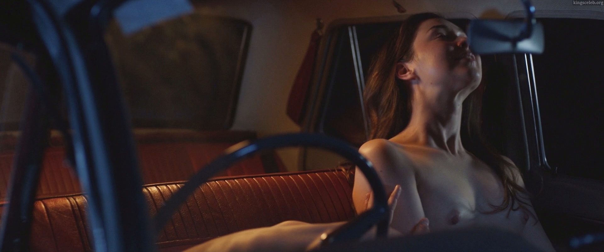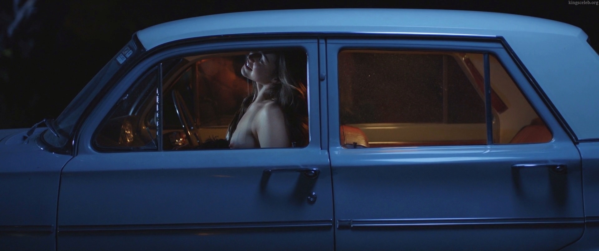 Guy kisses Lauren Goetz's bare chest in a blue car while a maniac runs around.