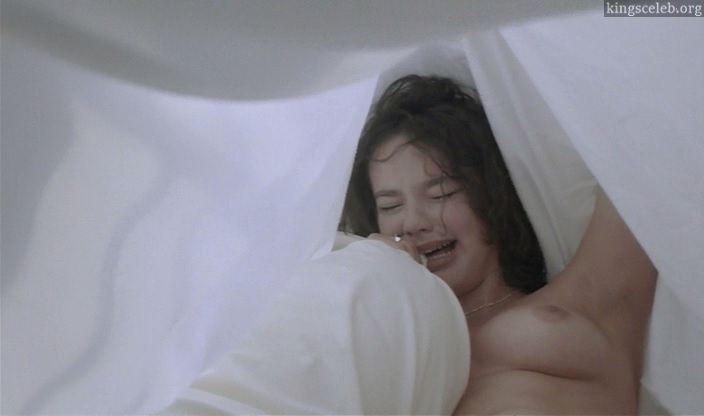 A naked Delphine Zentout lies on a bed, her head covered by a pillow, while a guy masturbates her pussy.