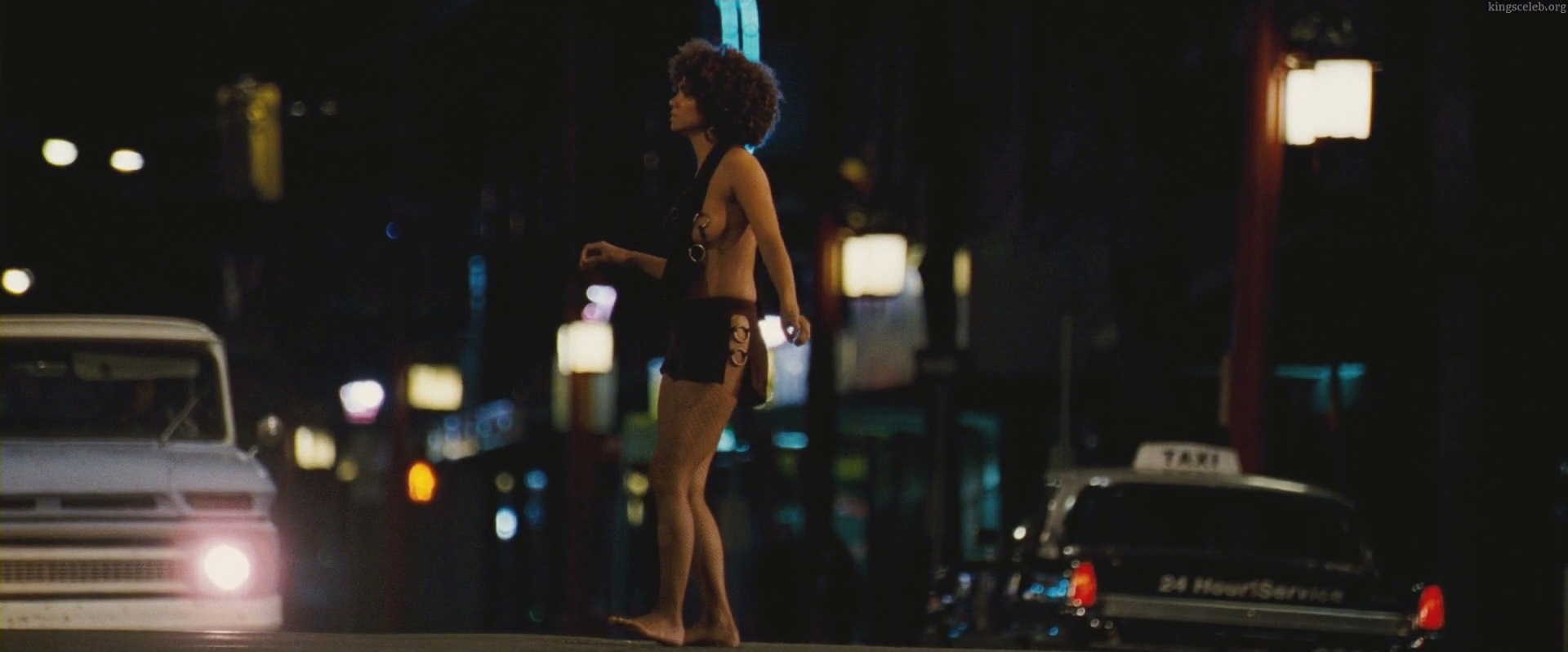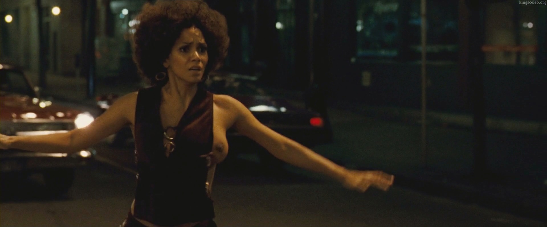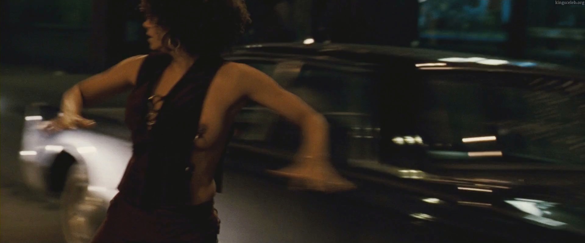 Having lost her bearings, Halle Berry runs out of the house and runs between cars on a busy highway with her dress unbuttoned, revealing a naked breast.