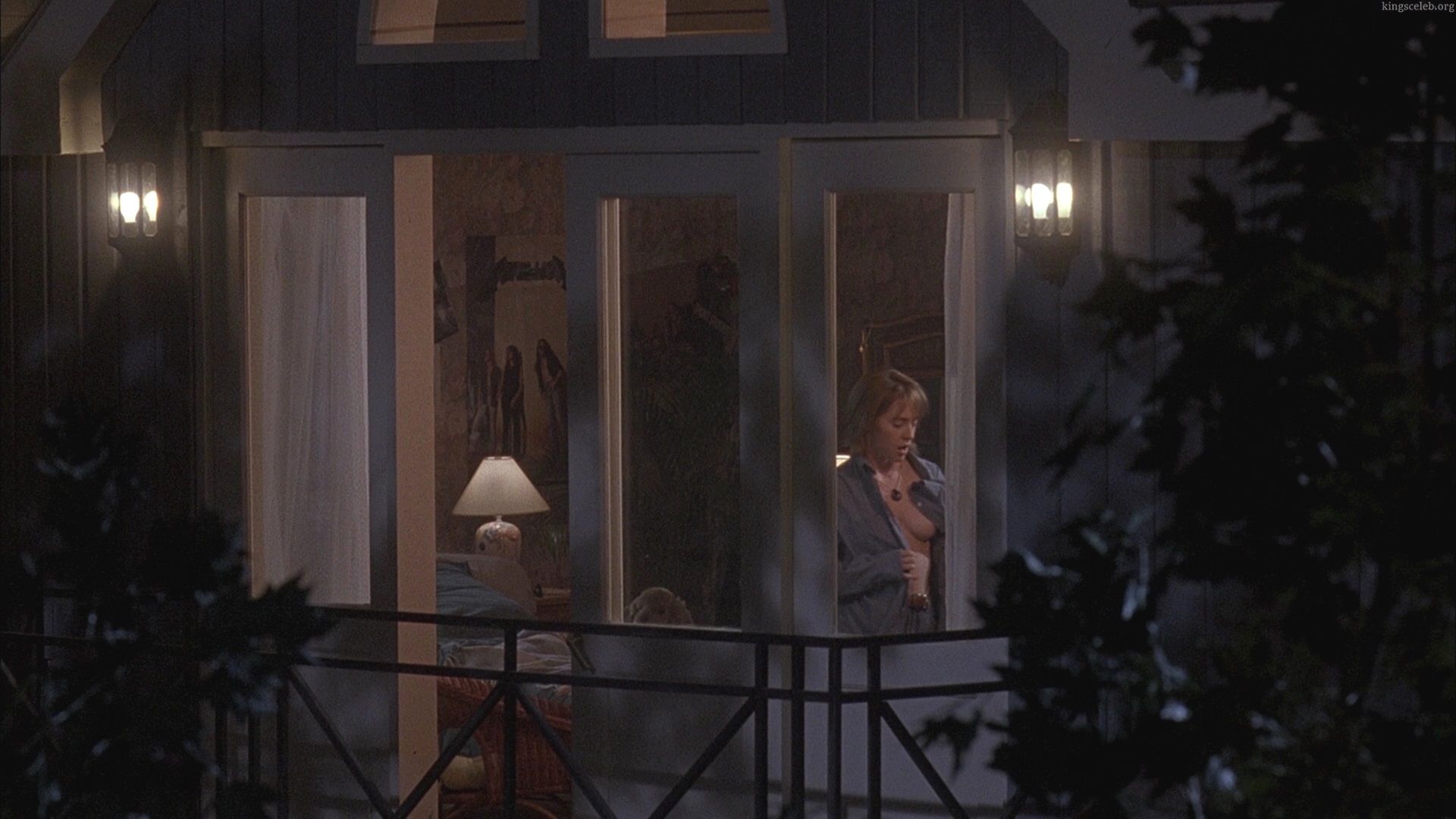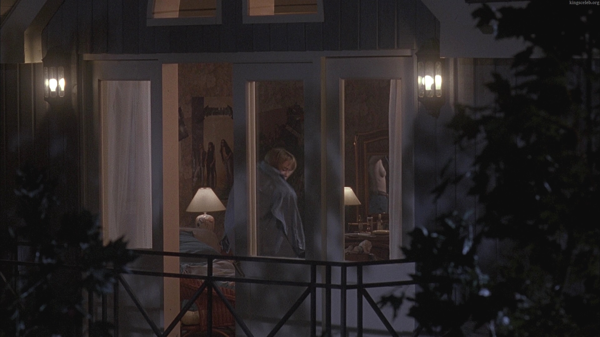 A guy peers through a window at Amy Hargreaves's bare chest as she changes clothes.