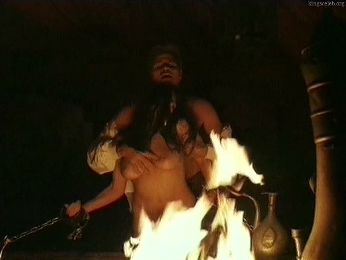A naked Patricia Skeriotis struggles to free herself from her chains while her savior duels her captor with swords.