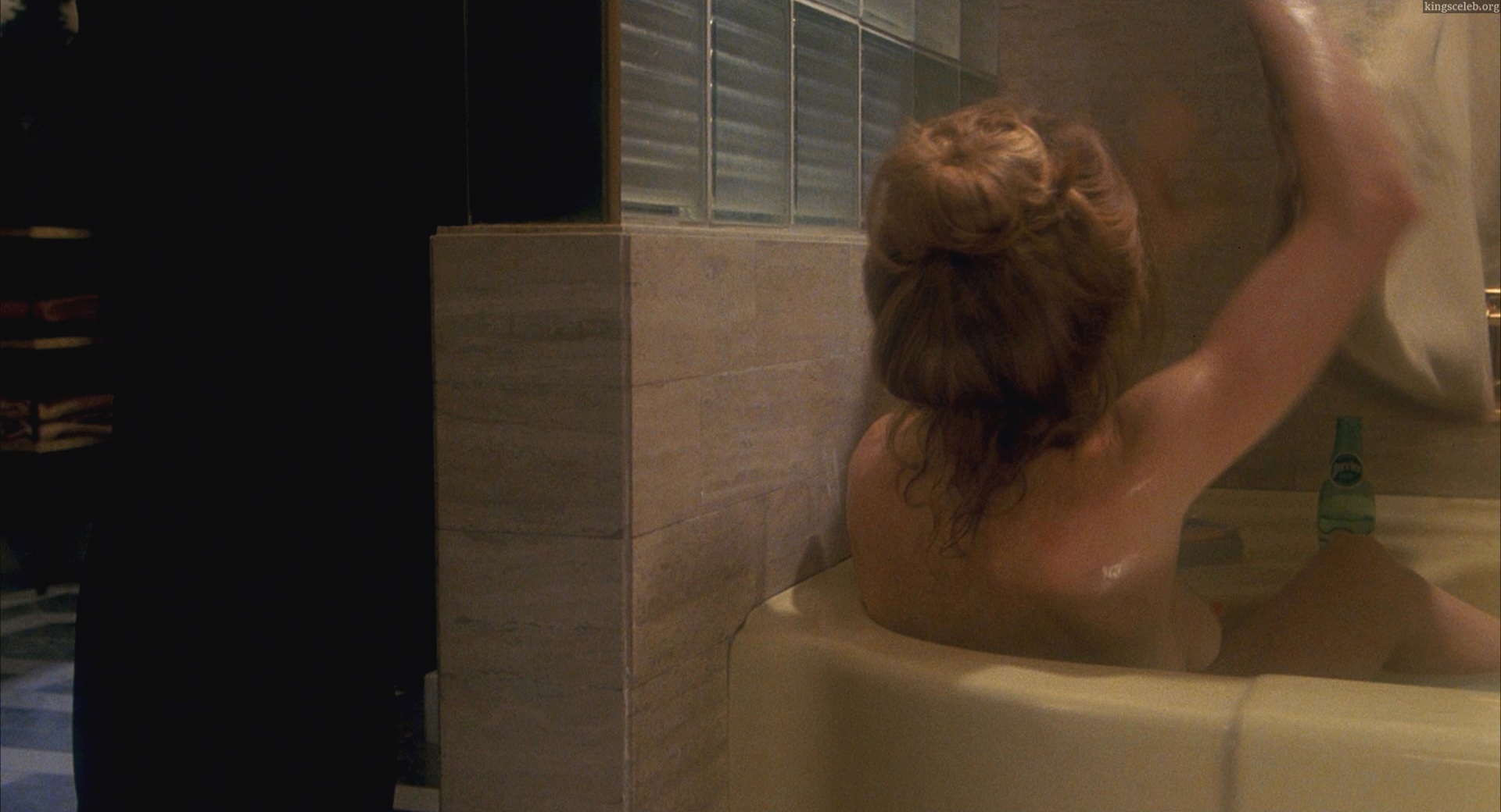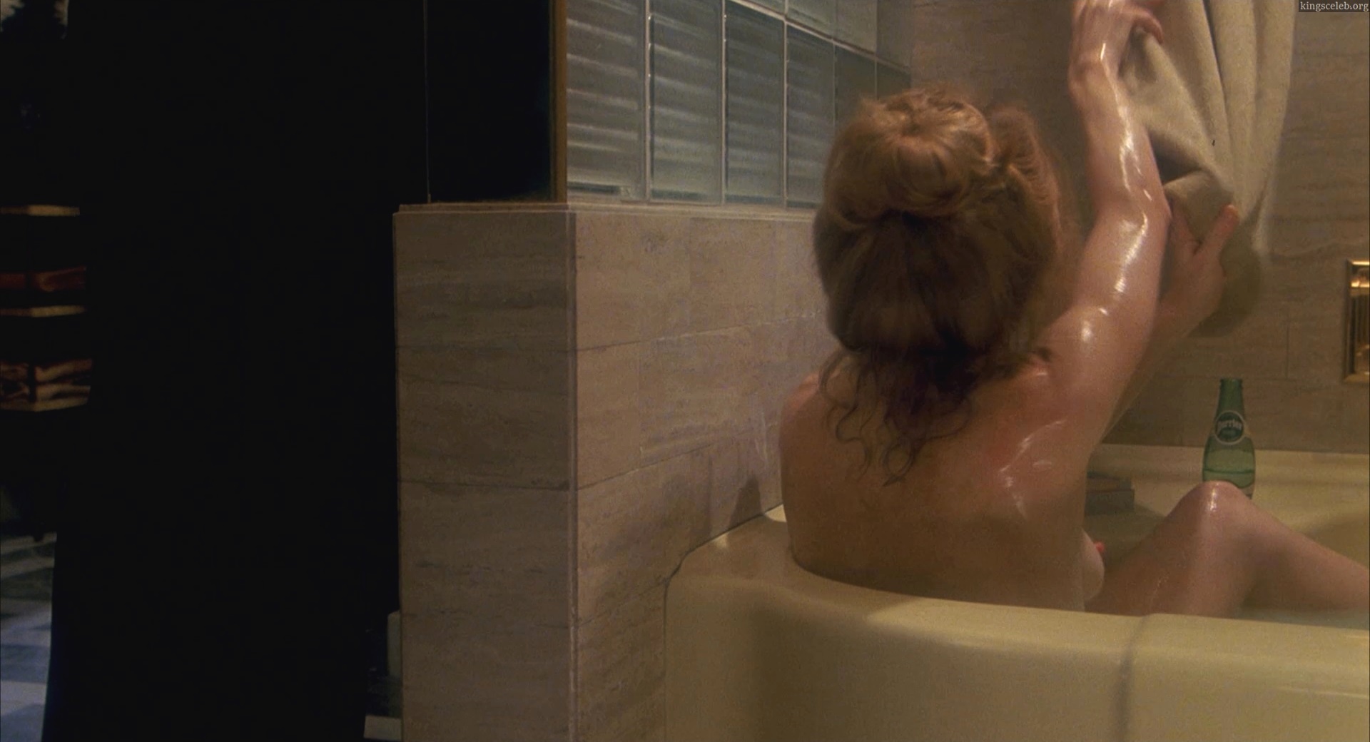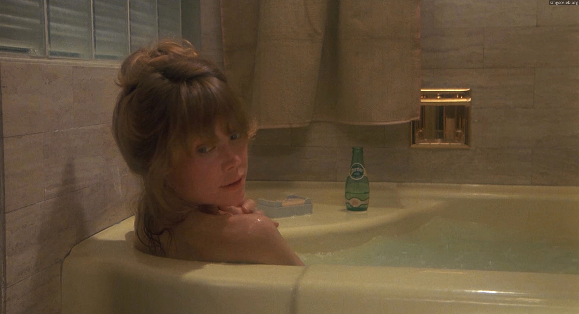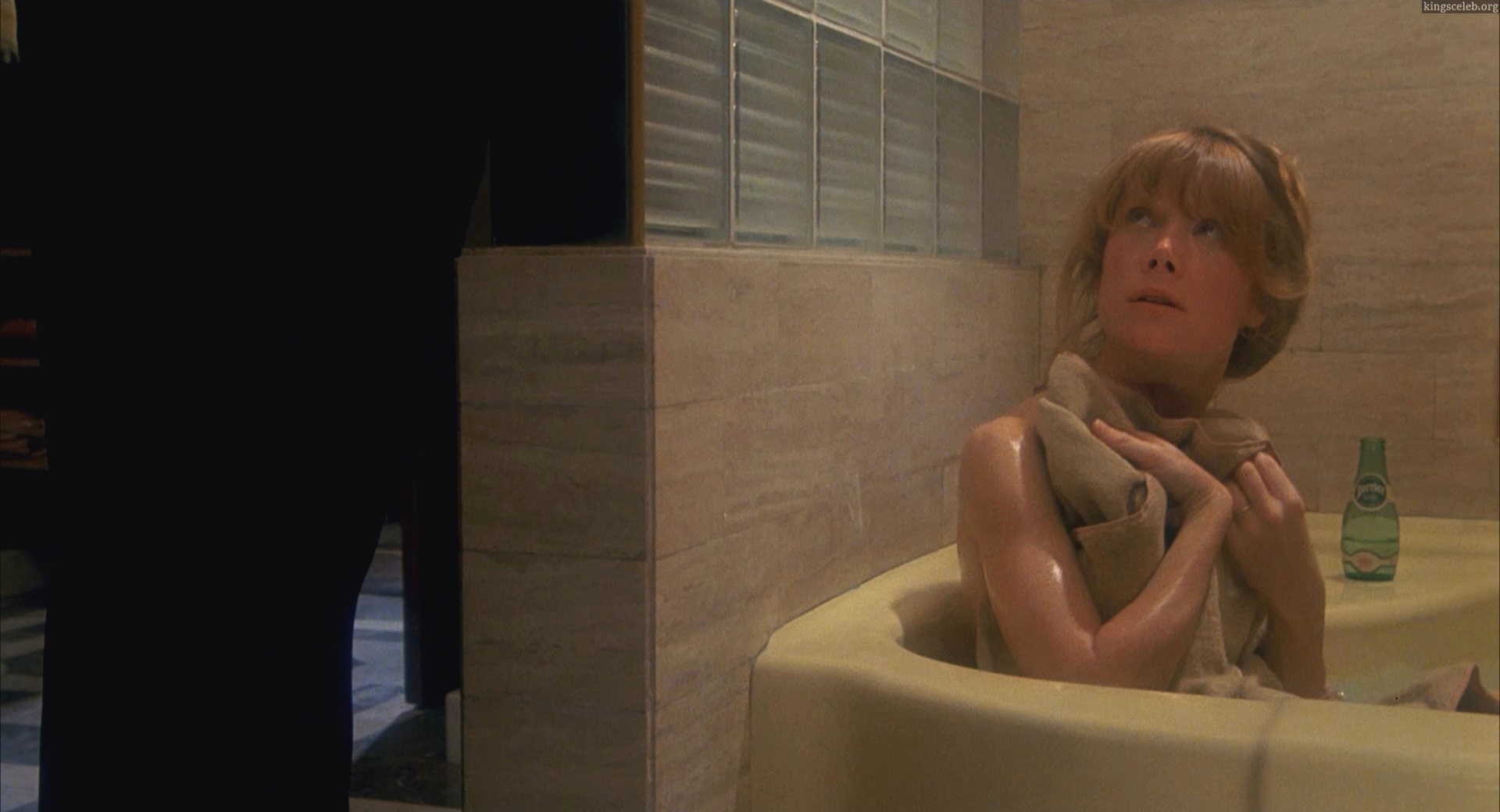Naked Sissy Spacek scared by a man entering the bathtub.