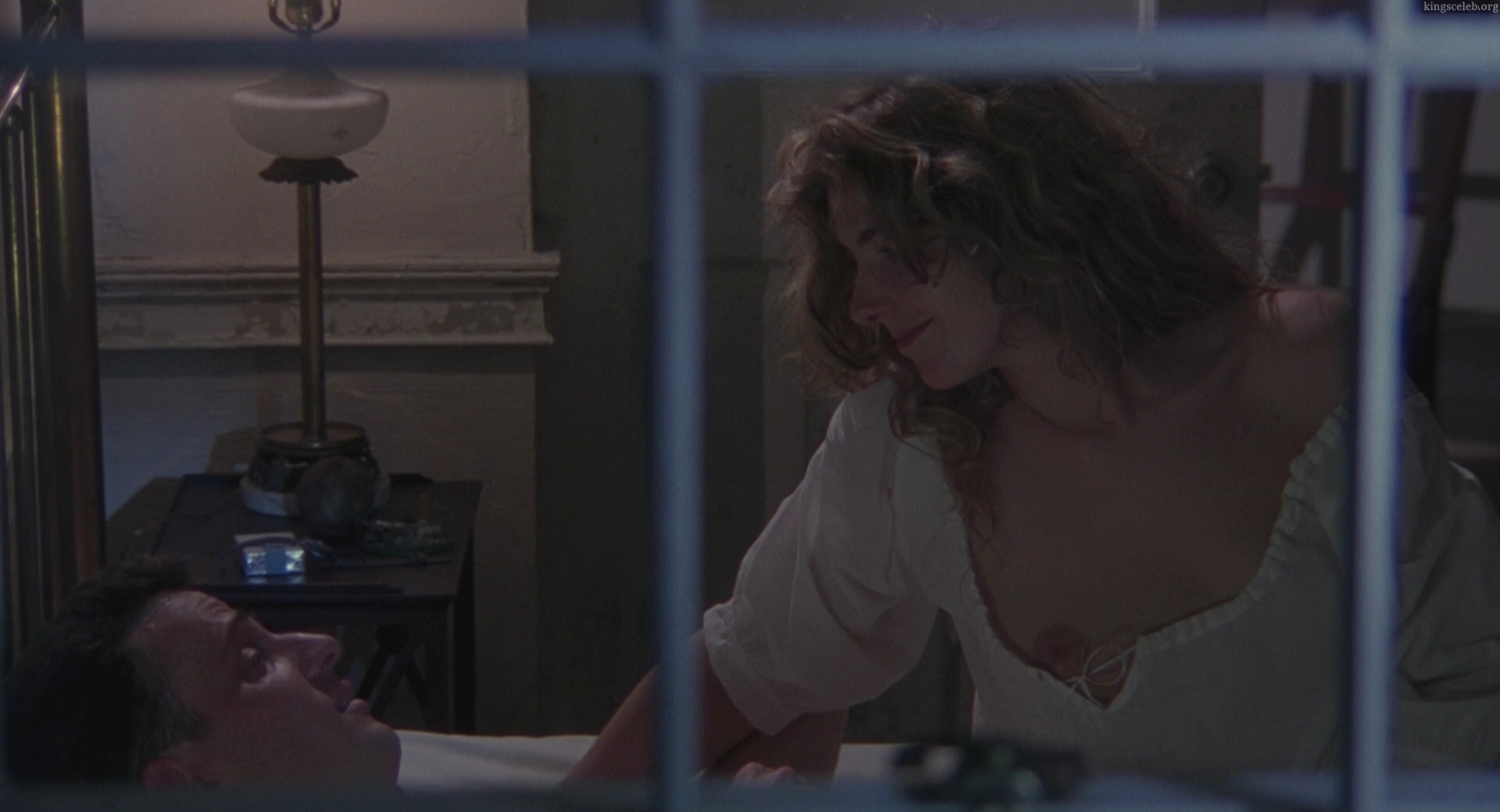Lover unties Natasha Richardson's nightgown and exposes her breasts.