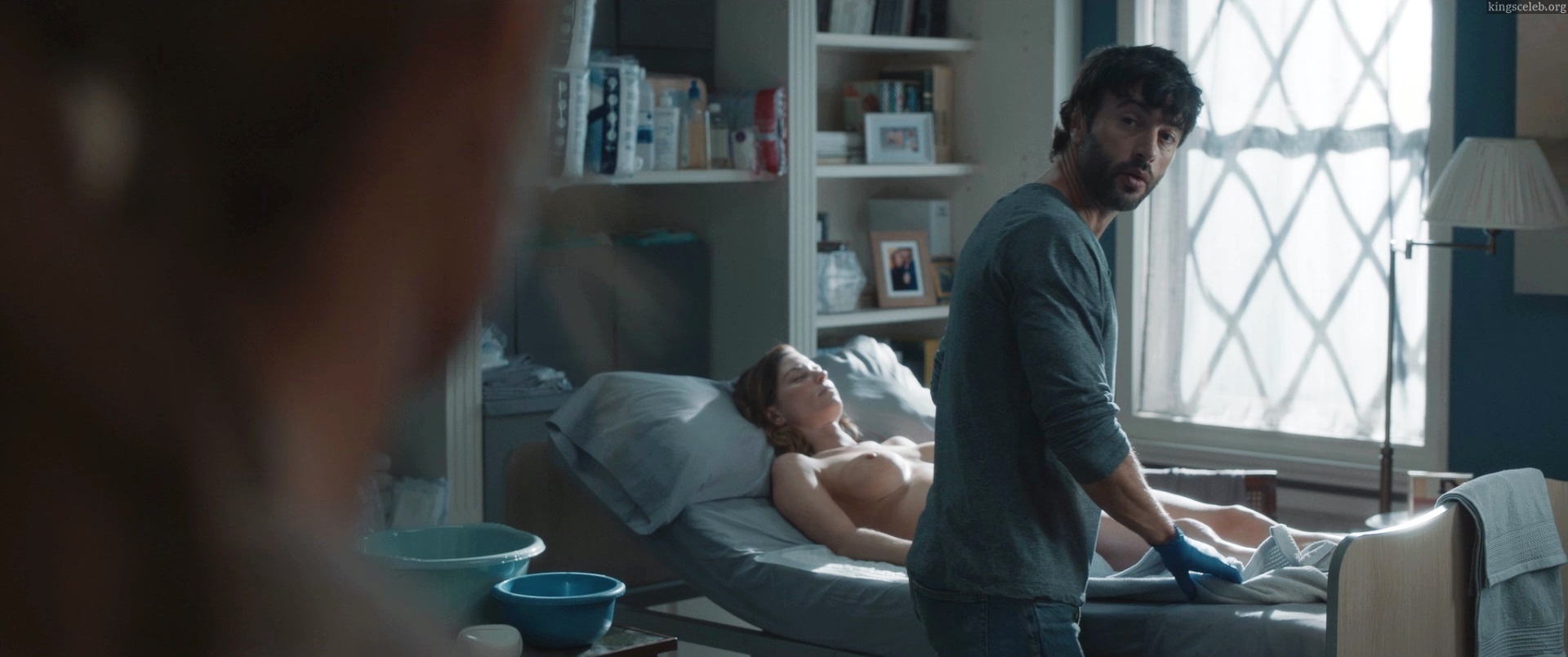 A naked Amanda Goldsmith lies on the couch while her husband talks to the caregiver.