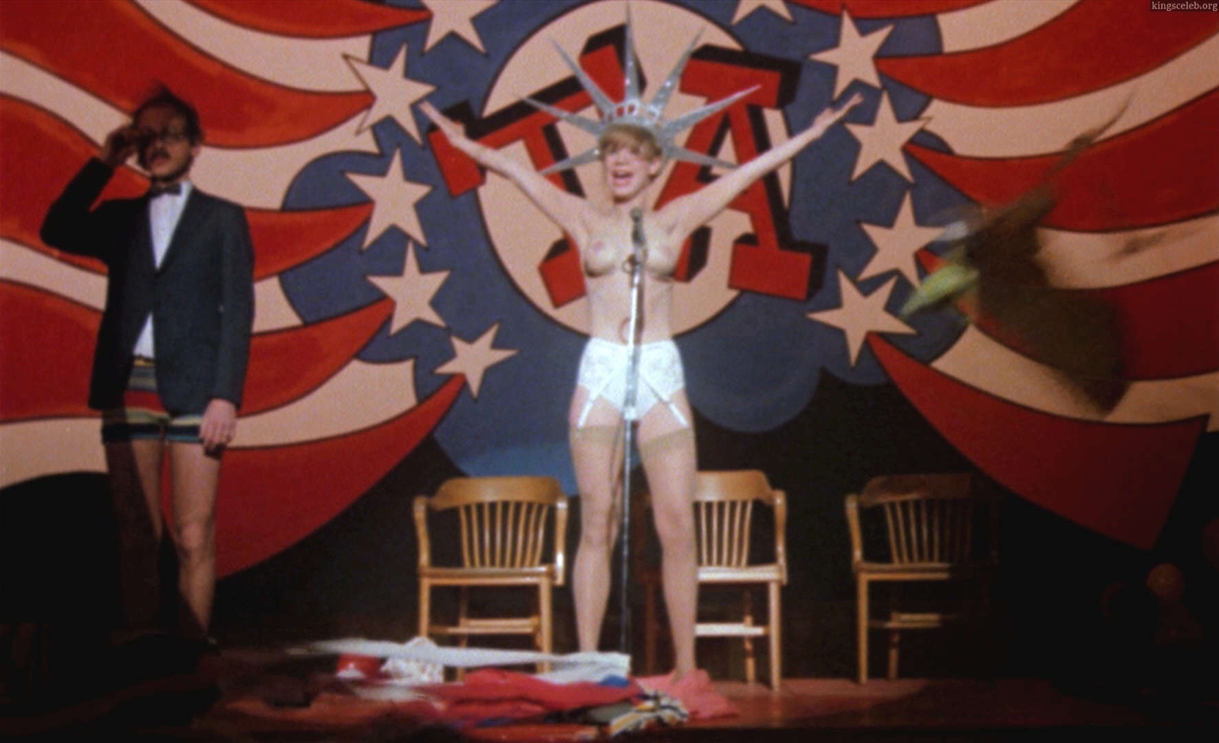 Linda Speciale is left naked on stage after a strong air flow blows away her Statue of Liberty costume.