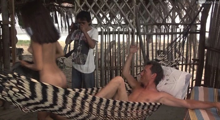 A naked Elpidia Carrillo relaxes with a photojournalist in a hammock.