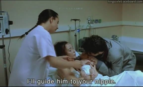 Marie Desgranges, lying in a hospital bed, attempts to breastfeed her baby.