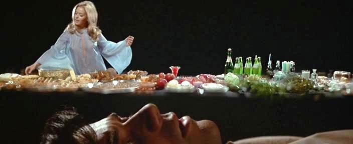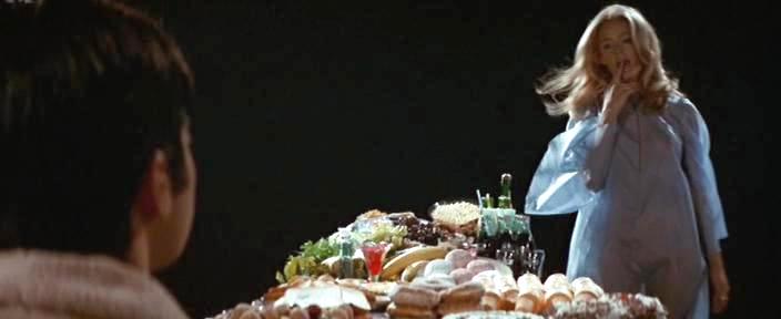 Farrah Fawcett, wearing a sheer robe, walks around a table full of various dishes but decided to eat a banana.