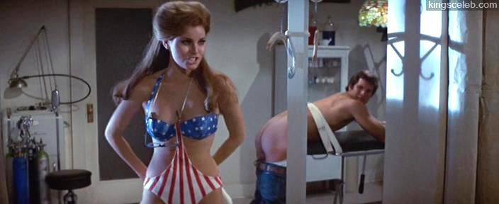 Raquel Welch, wearing an American flag-colored bikini, talks to a bare-assed man.
