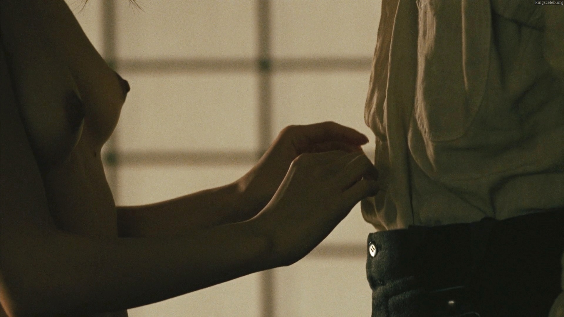 Naoko Watanabe takes off her kimono, lets her hair down, walks up to the guy, unfastens his belt and takes off his shirt to make love to him.