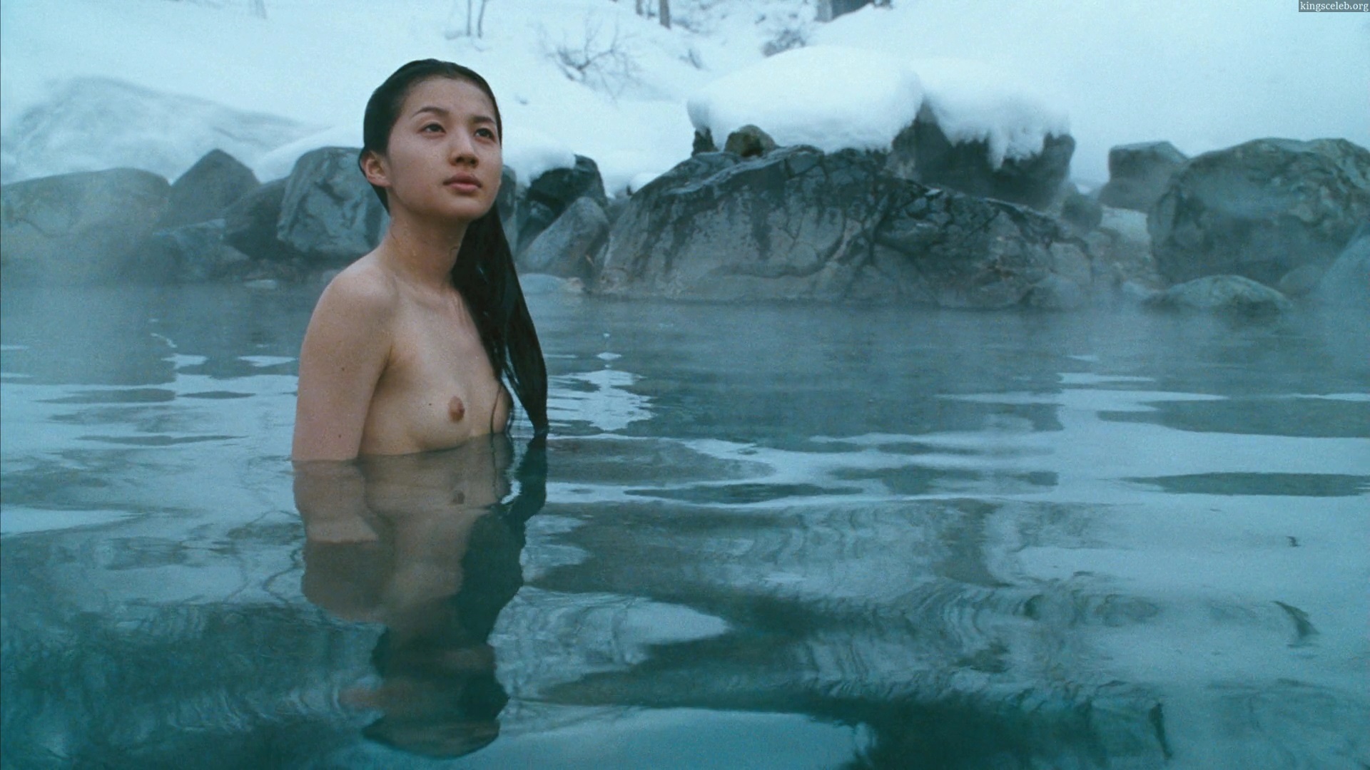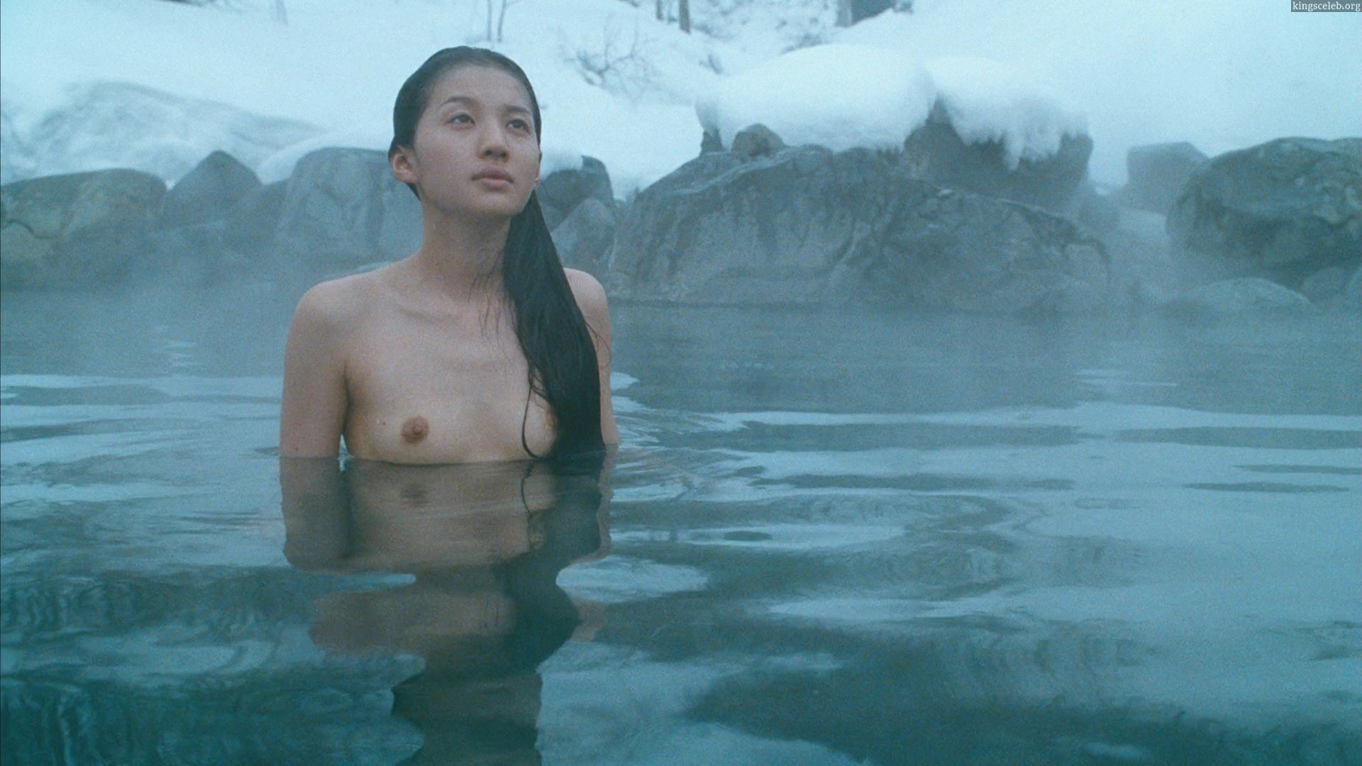 Sei Ashina shows her bare chest while standing in the water between the snows.