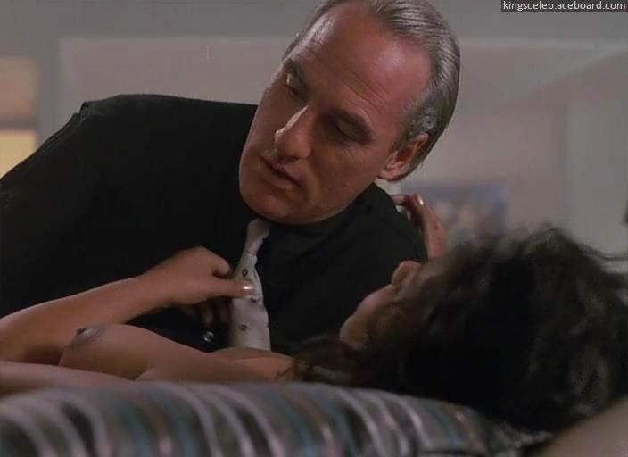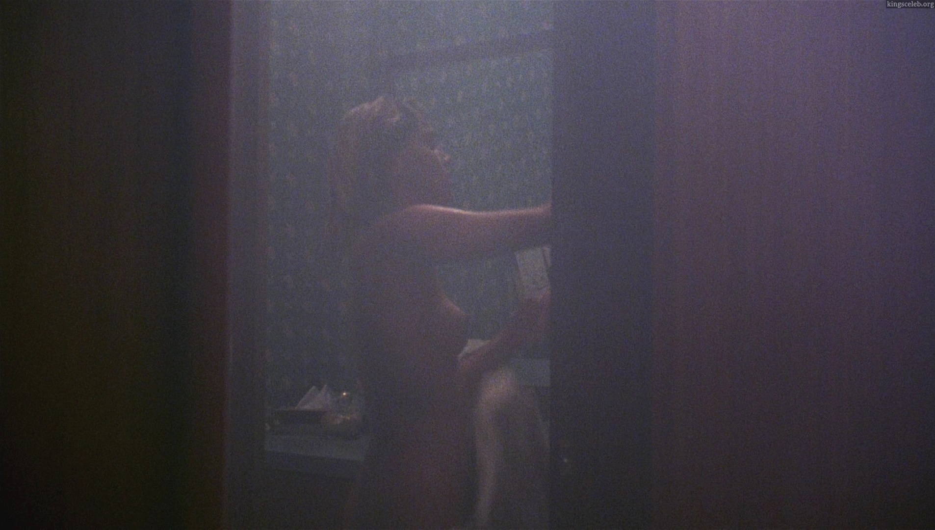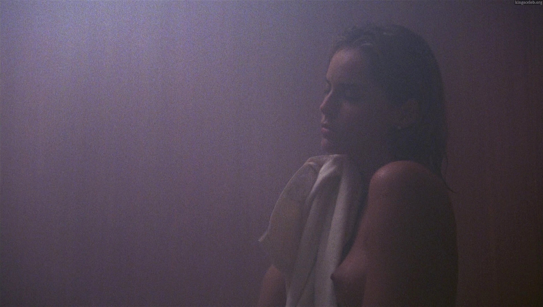 Naked Sharon Stone emerges from the bathhouse and, in front of the mirror, puts on a robe.