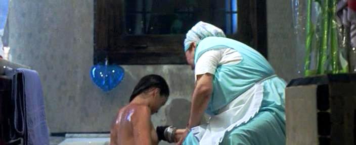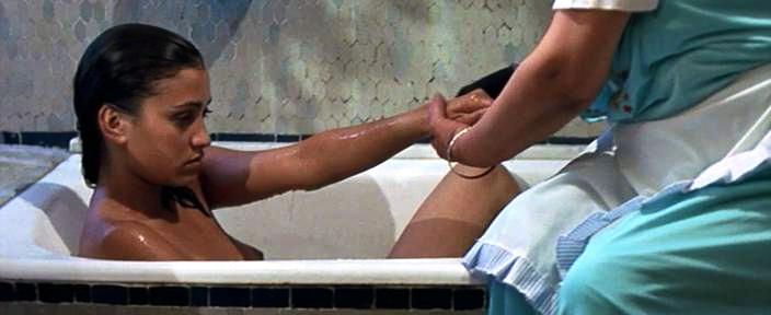 Naked Morjana Alaoui takes a bath.